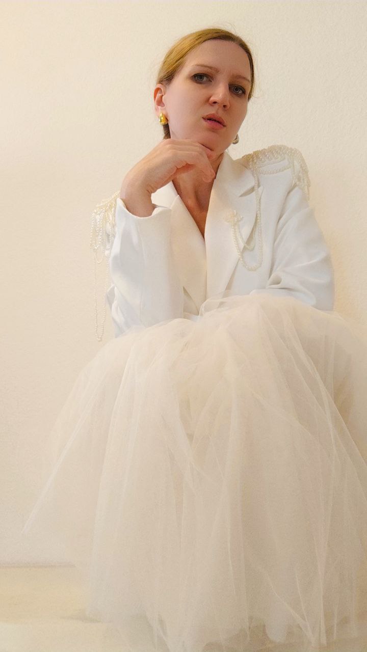 Ein Set aus dem weissen Blazer mit Perlenstickerei im Stil Military und einem Tüllrock aus Polyester ist ein Statement für Klasse und Stil.
