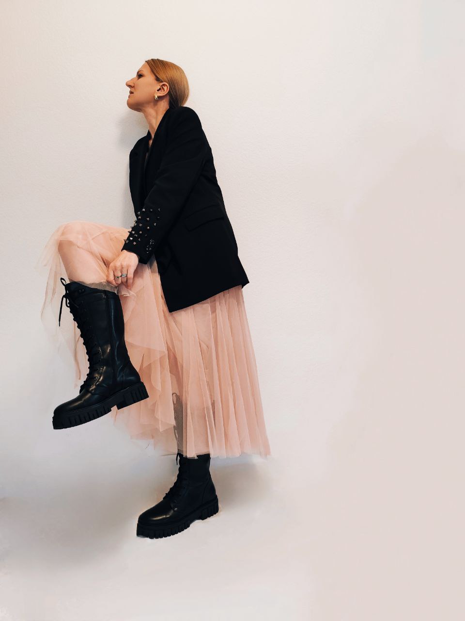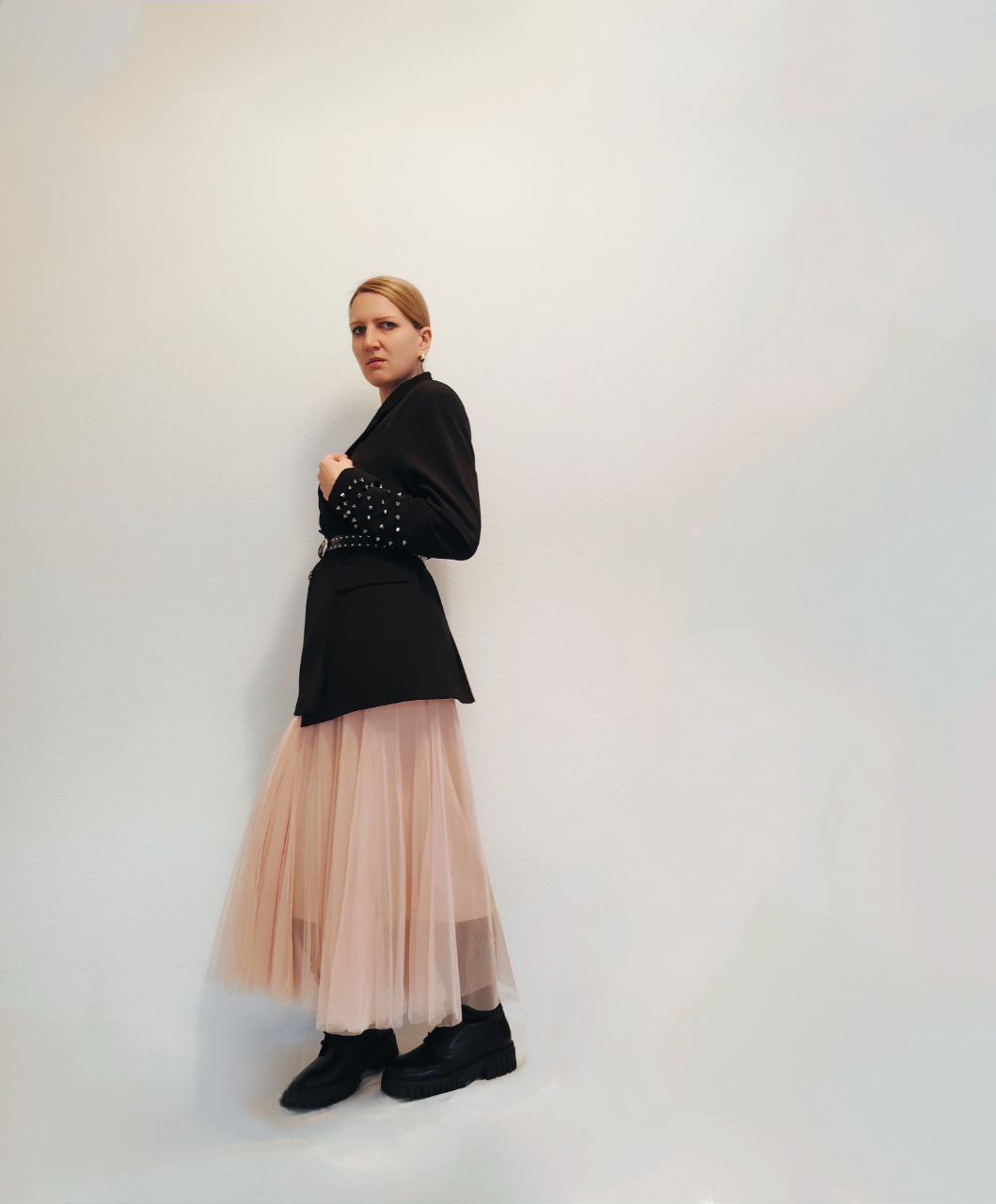 Ein Set aus dem schwarzen Blazer mit Nieten und einem Tüllrock aus Polyester