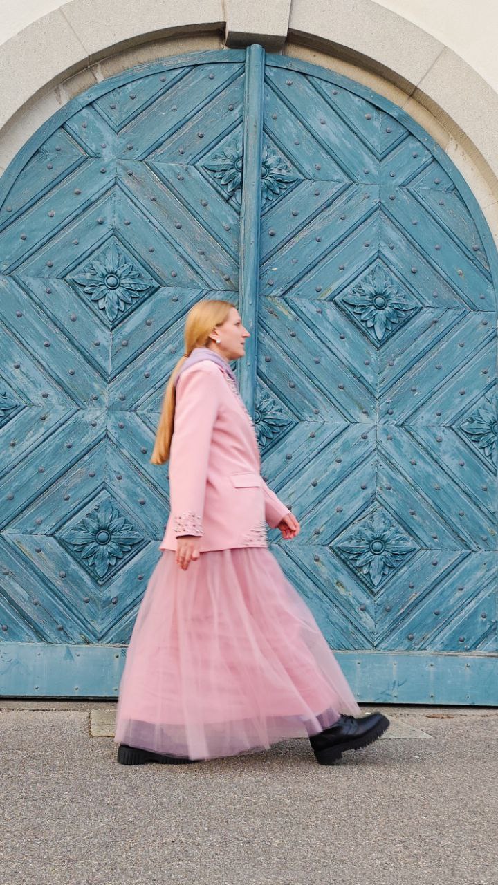 Ein zartrosafarbener Blazer mit funkelnden Details, kombiniert mit einem traumhaften Tüllrock.