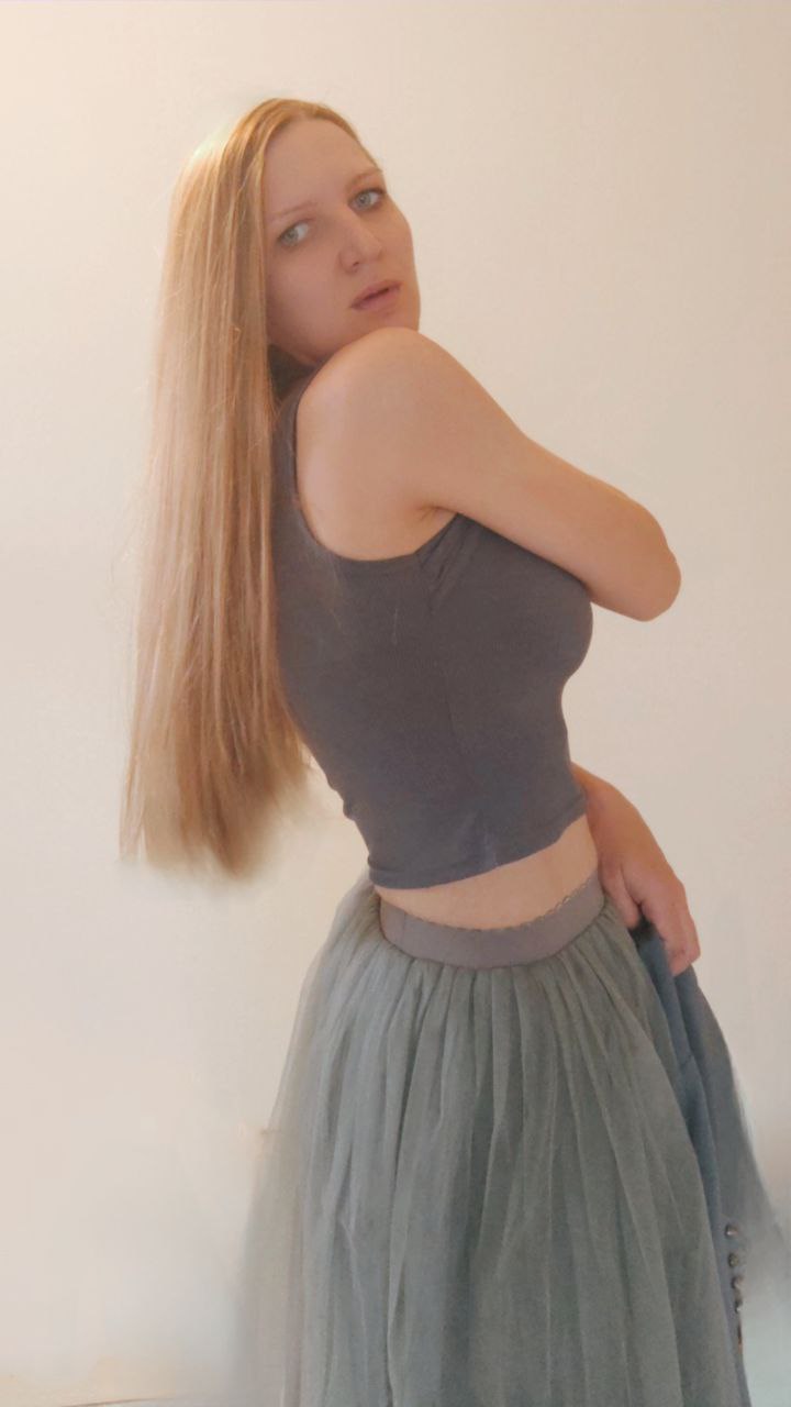 Ein Set aus dem blau-grauen Blazer mit Nieten, einem Top und einem Tüllrock aus Polyester