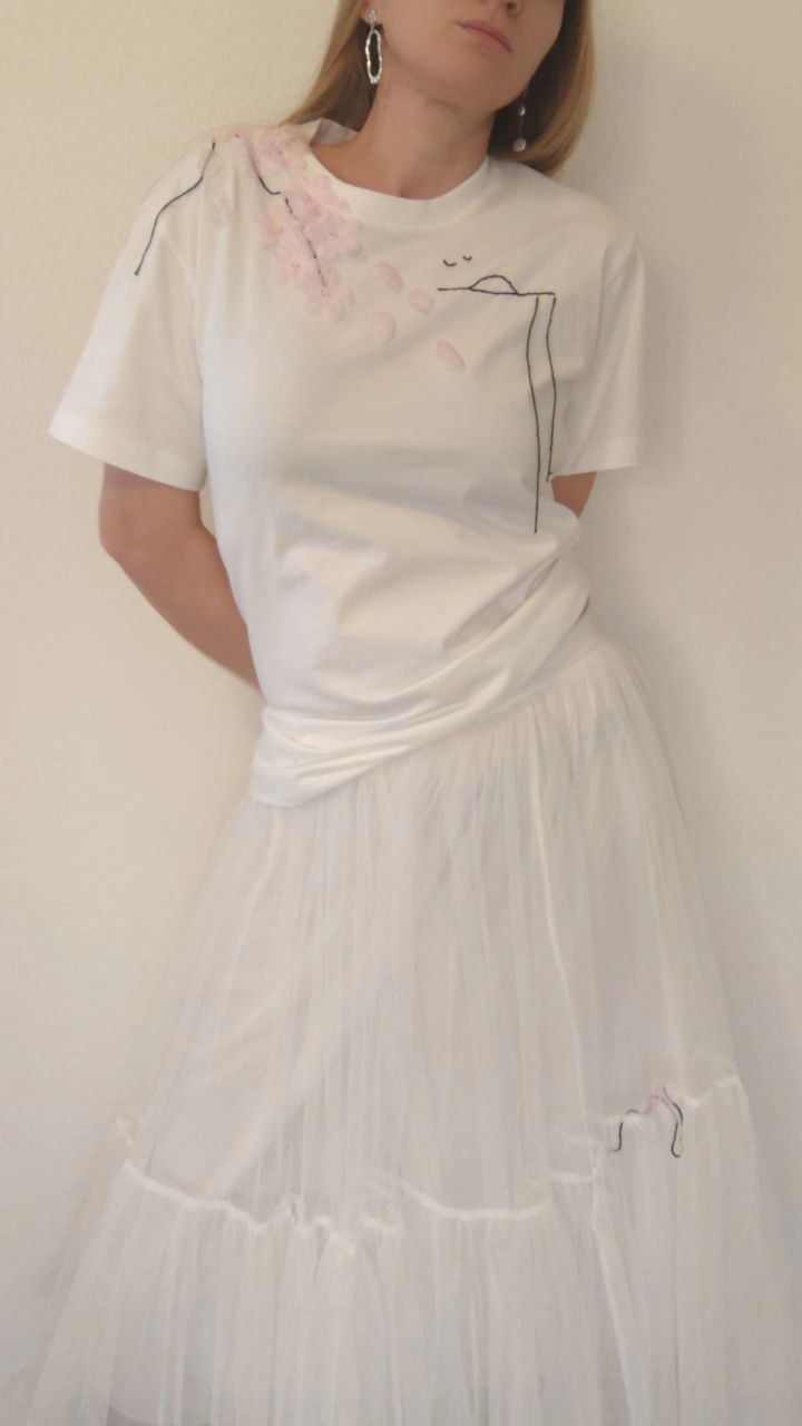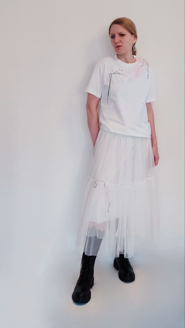 Eine Kombination aus eine weissen Tüllrock aus Polyester mit einem T-Shirt aus 100% Premium-Baumwolle
